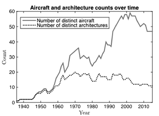 First, according to Utterback (Utterback, 1994), most industries are expected to follow a pattern of an initial period of multitudes of experiments and major product innovations that eventually give way to a phase where such activities dwindle, and product innovations become mostly small, incremental steps. The aviation industry is seemingly in such a phase. As shown in Figure 1, the number of unique aircraft designs and architectures is decreasing after a phase of growth during a formative period from the 1930s to the 1990s, and aircraft innovations now revolve around a dominant design (Murman, Walton, and Rebentisch, 2016).