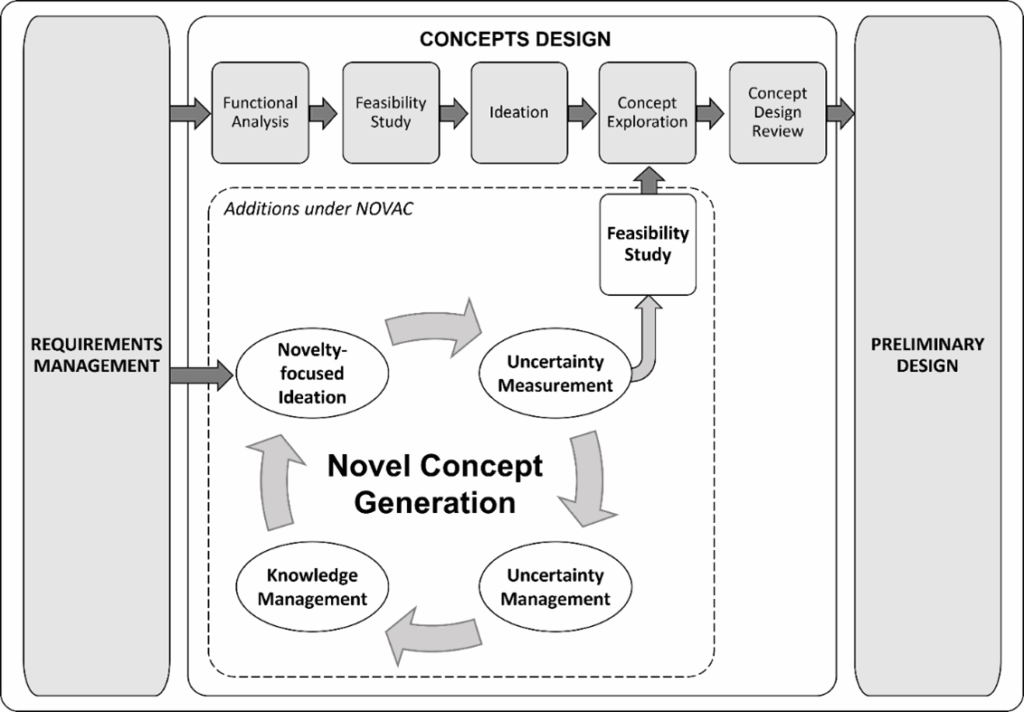 The effectiveness of NOVAC has been evaluated through a correlational study involving teams of practicing aeronautical engineers exercising a design task with and without the NOVAC approach (Jeoh, 2024). In this study, the Novelty-focused Ideation method was found to be potentially useful in generating more aircraft concepts. Results on concept variety were limited due to a small sample size but indicated a possible positive effect through NOVAC’s proposed Novelty-focused ideation process. The study also made observations supporting the need for Knowledge Management for more novel concept generation, while the impact of Uncertainty Measurement and Management on facilitating radical innovations has yet to be evaluated.