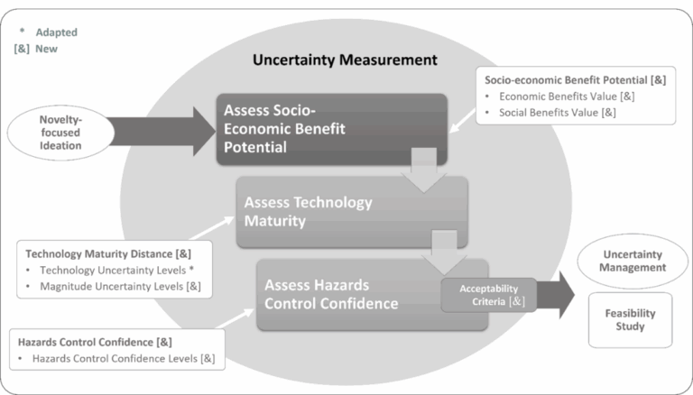 Uncertainty management, as shown in Figure 5, is a step involving the iterative prototyping, testing, and analysis to improve knowledge of technologies used in a concept that has not passed the acceptability criteria during uncertainty measurement. The aim in this stage is to test and learn to gain a better understanding of socio-economic benefit potentials, potential hazards, or to advance technology maturity.
